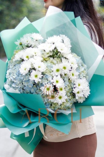 - Số lượng hoa gồm: hoa cúc mix với hoa tú cầu xanh