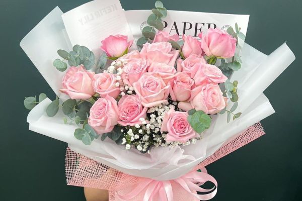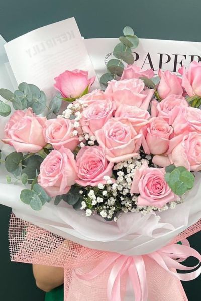 - Bó hoa là sự kết hợp giữa hoa hồng ngọt ngào màu hồng, cùng hoa bi kết hợp cùng lá dola nhẹ nhàng mà tinh tế