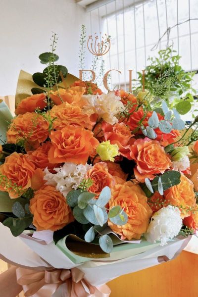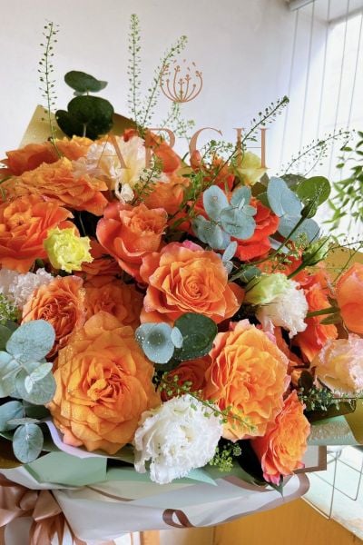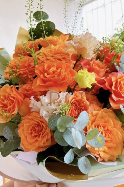 - Bó hoa tông cam đơn giản gồm hoa hồng spirit, hoa cát tường , kết hợp cùng các loại lá rực rỡ và trẻ trung sang trọng,thích hợp cho những cô nàng cá tính.