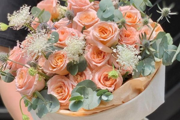 - Bó hoa tông cam đơn giản gồm hoa hồng Juliet, hoa ren trắng kết hợp cùng lá đola trên rực rỡ và trẻ trung sang trọng,thích hợp cho những cô nàng cá tính.