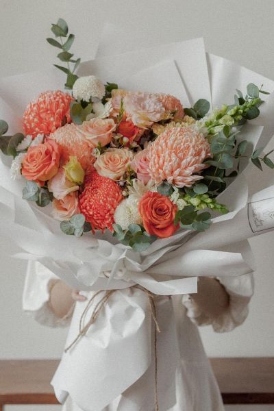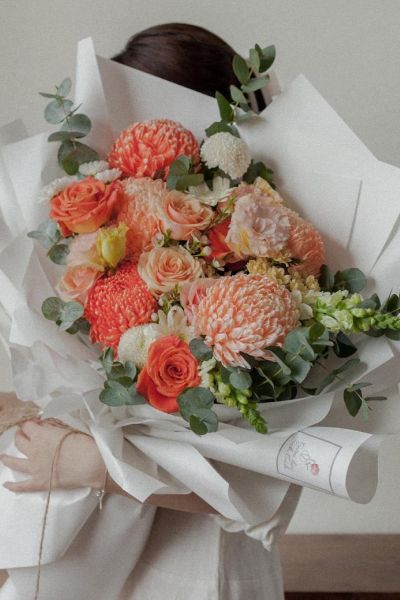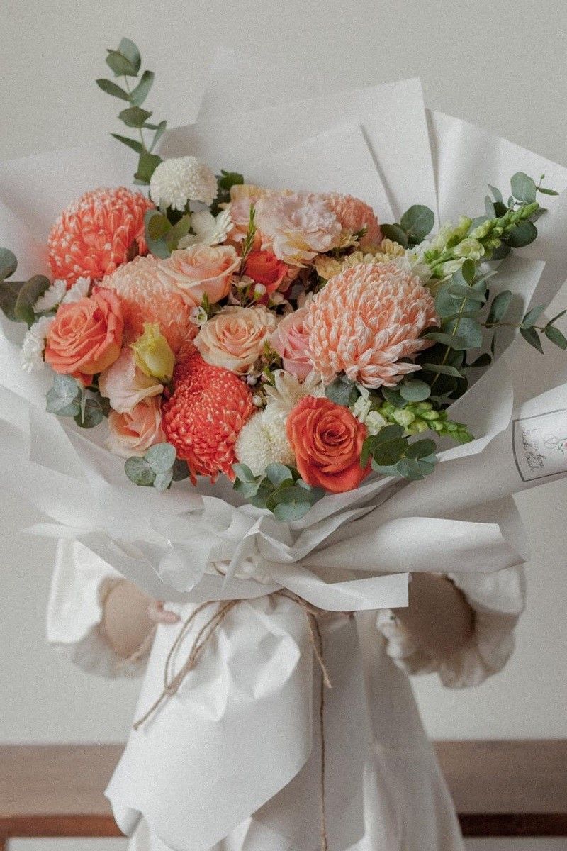 - Là sự kết hợp hoàn hảo giữ hoa cúc mẫu đơn màu cam, hoa hồng màu hồng cam,hoa hồng màu đỏ cam , hoa cúc pinpon trắng ,hoa đồng tiền trắng, hoa mõm sói trắng, hoa cát tường trắng, hoa cẩm chướng trắng trên nền lá bạc....