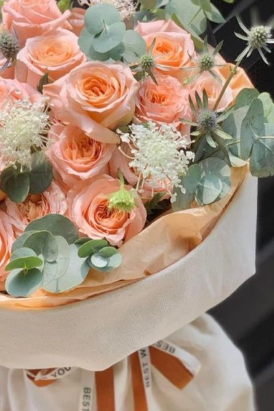- Bó hoa tông cam đơn giản gồm hoa hồng Juliet, hoa ren trắng kết hợp cùng lá đola trên rực rỡ và trẻ trung sang trọng,thích hợp cho những cô nàng cá tính.