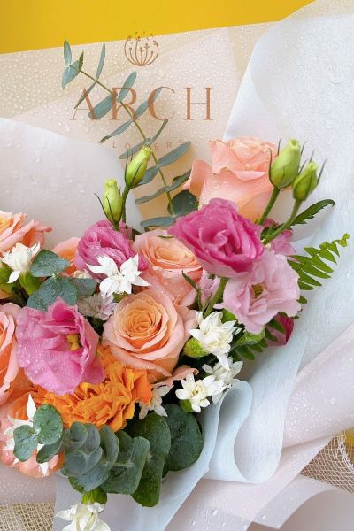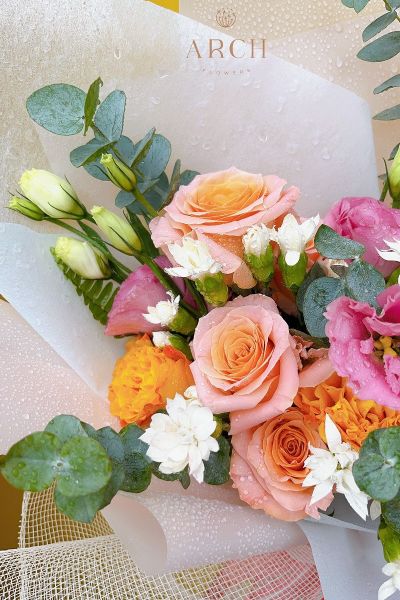 Bó hoa chúc mừng nho nhỏ bé xinh là sự kết hợp đơn giản giữa những bông hoa hồng Spirit cam , hoa cát tường hồng,hoa cẩm chướng trắng kết hợp cùng các loại lá...