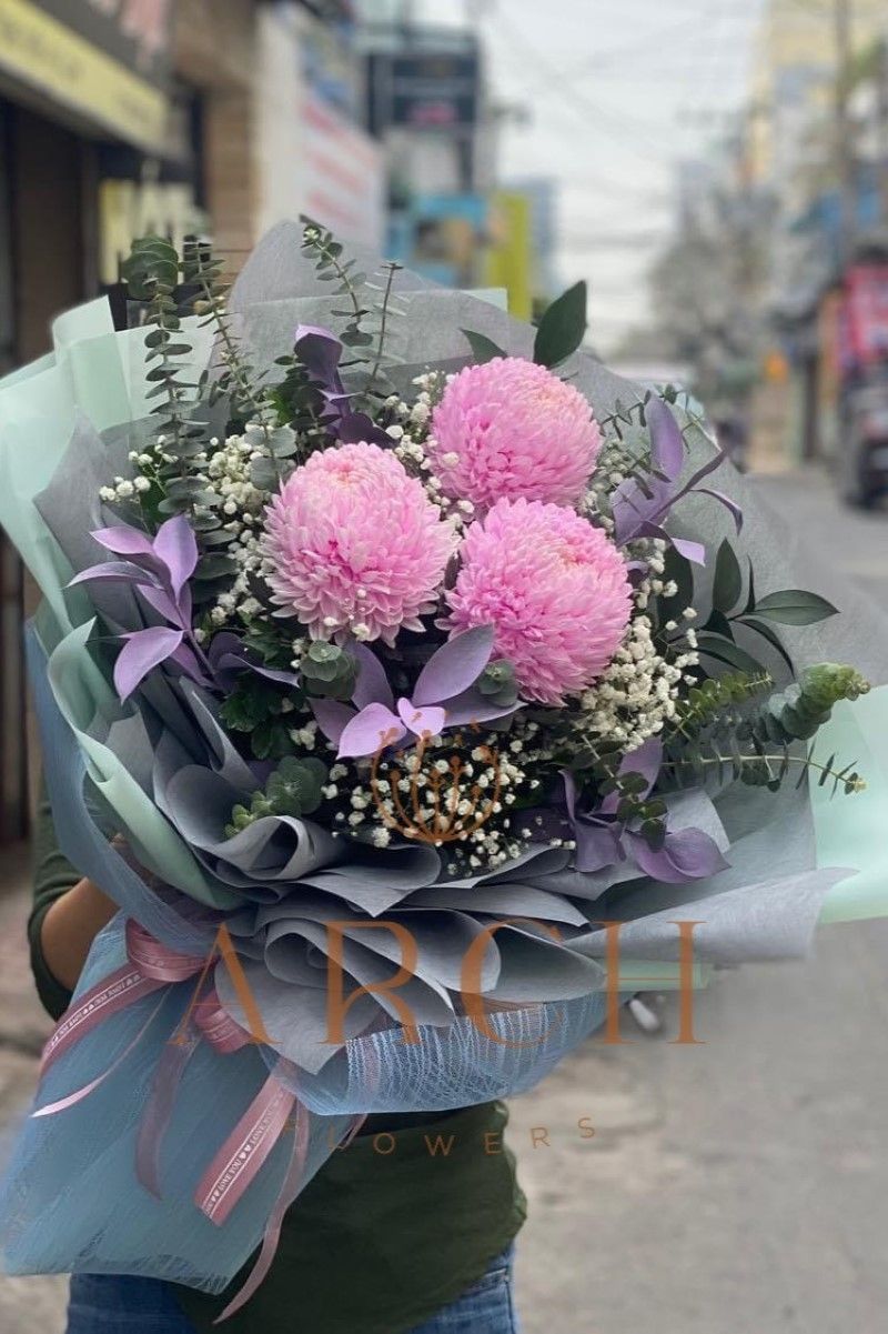 - Size vừa: từ 3 bông hoa cúc mẫu đơn hồng, hoa lá phụ