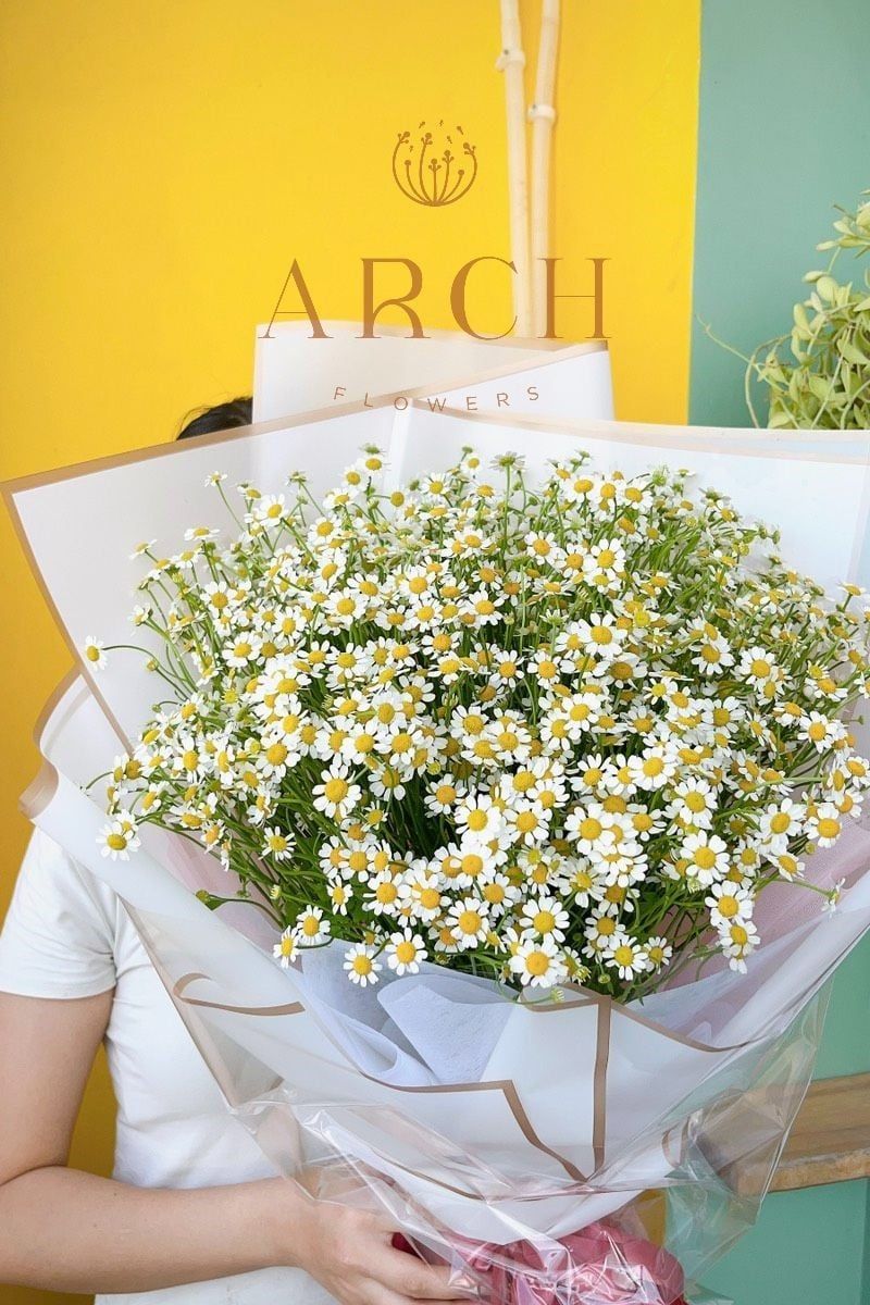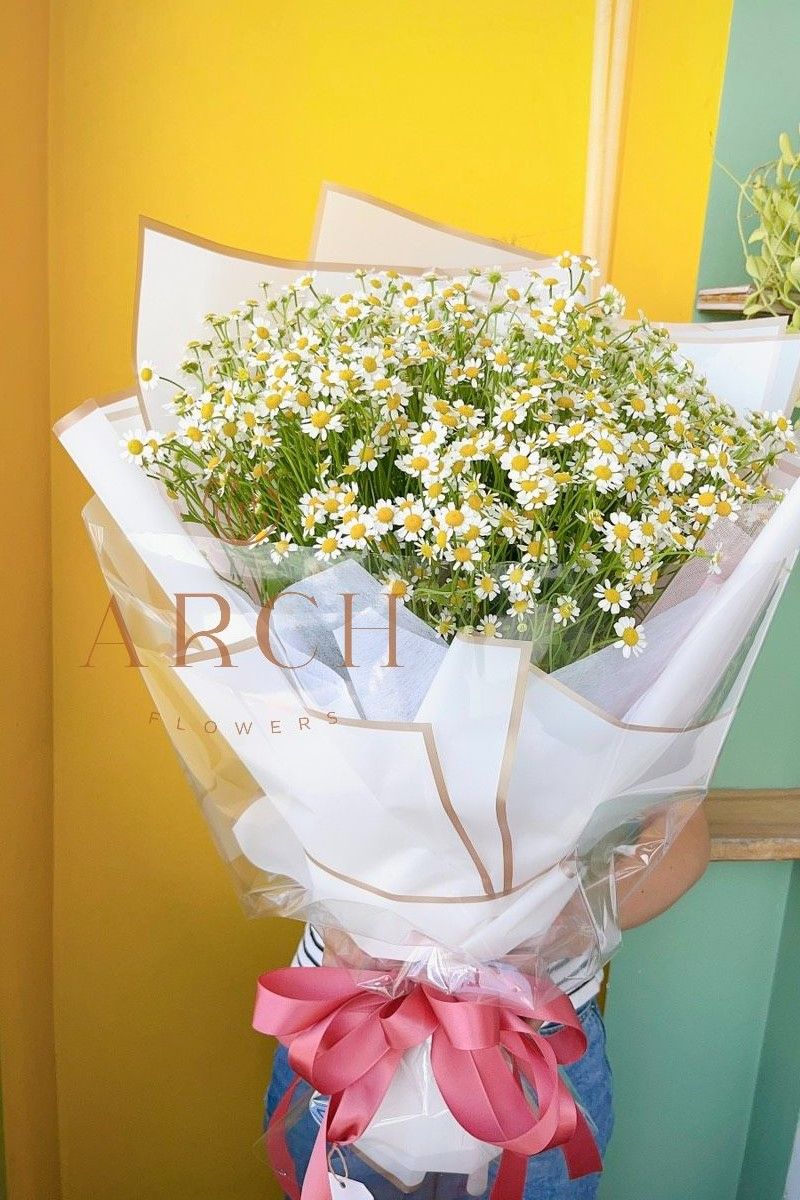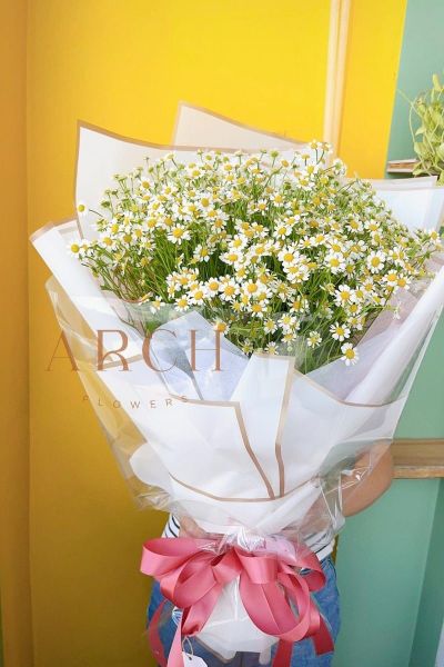 - Ngoài mẫu bó hoa cúc ta na, con có lẵng hoa hoặc bình thủy tinh hoa cúc ta na