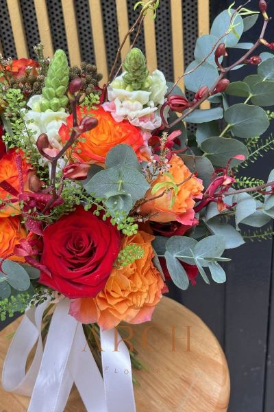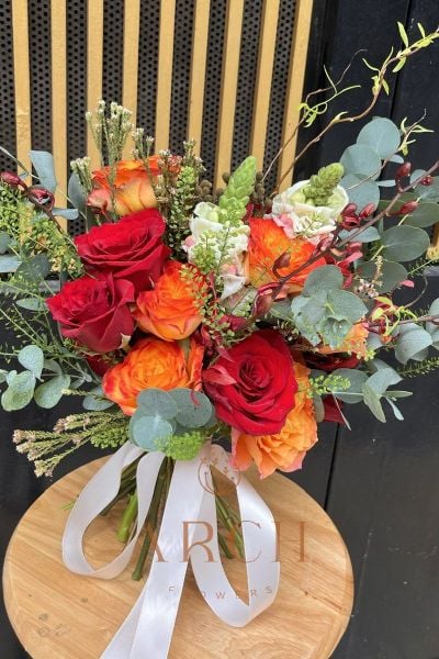- Tone màu đỏ kết hợp 1 vài bông hồng cam, hoa mõm sói tạo nên sự rực rỡ cho bó hoa cưới cầm tay.