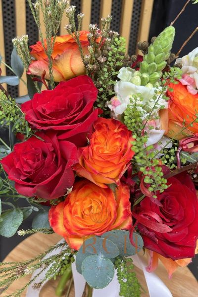 - Bó hoa gồm: Hoa hồng cam spirit giống nhập,hoa hồng đỏ,hoa hồng trắng,hoa mõm sói kết hợp cùng hoa lan đỏ, cỏ Nam Phi, cành Salic và các loại lá ...