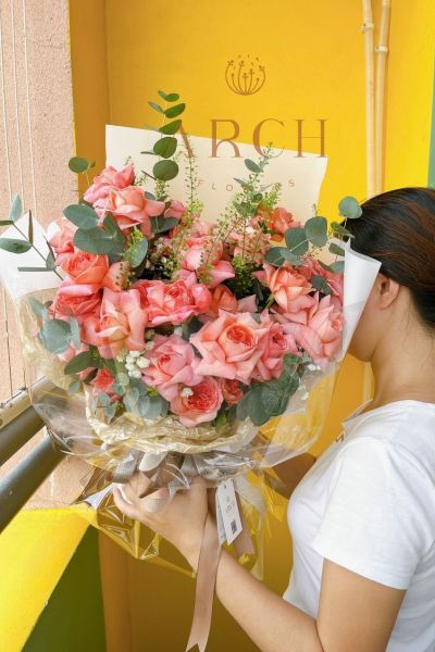 - Bó hoa tông cam đơn giản gồm hoa hồng sim màu cam, hoa ren trắng kết hợp cùng lá đola trên rực rỡ và trẻ trung sang trọng,thích hợp cho những cô nàng cá tính.