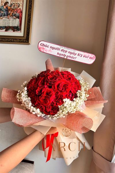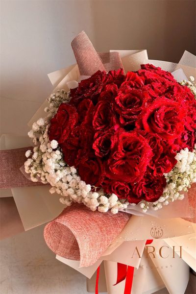 - Bó hoa hồng đỏ Ohara thường được sắp xếp tỉ mỉ và tinh tế. Những bông hoa lớn nằm ở trung tâm, bao quanh bởi các loại hoa phụ như hoa baby’s breath trắng, thạch thảo tím hoặc cúc nhỏ, tạo nên sự cân đối và điểm nhấn mềm mại cho bó hoa.