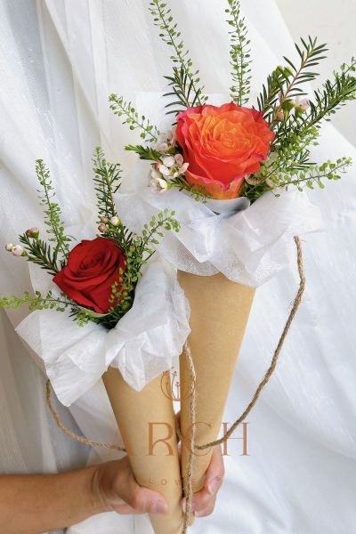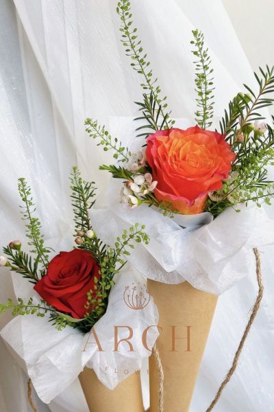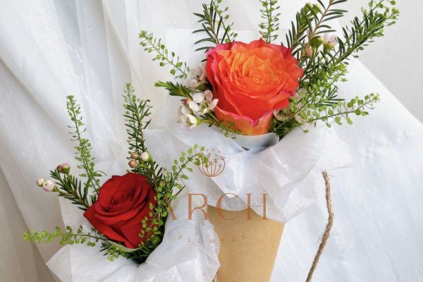 - Bó hoa chúc mừng đơn giản chỉ gồm: 1 bông hoa hồng đỏ hoặc cam hoặc hồng kết hợp cùng hoa bibi nhập khẩu và các loại lá.