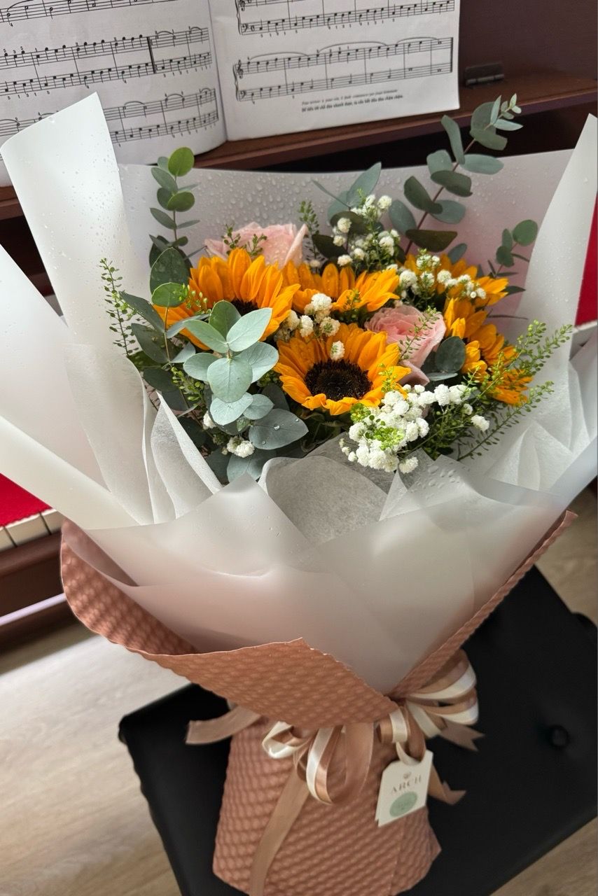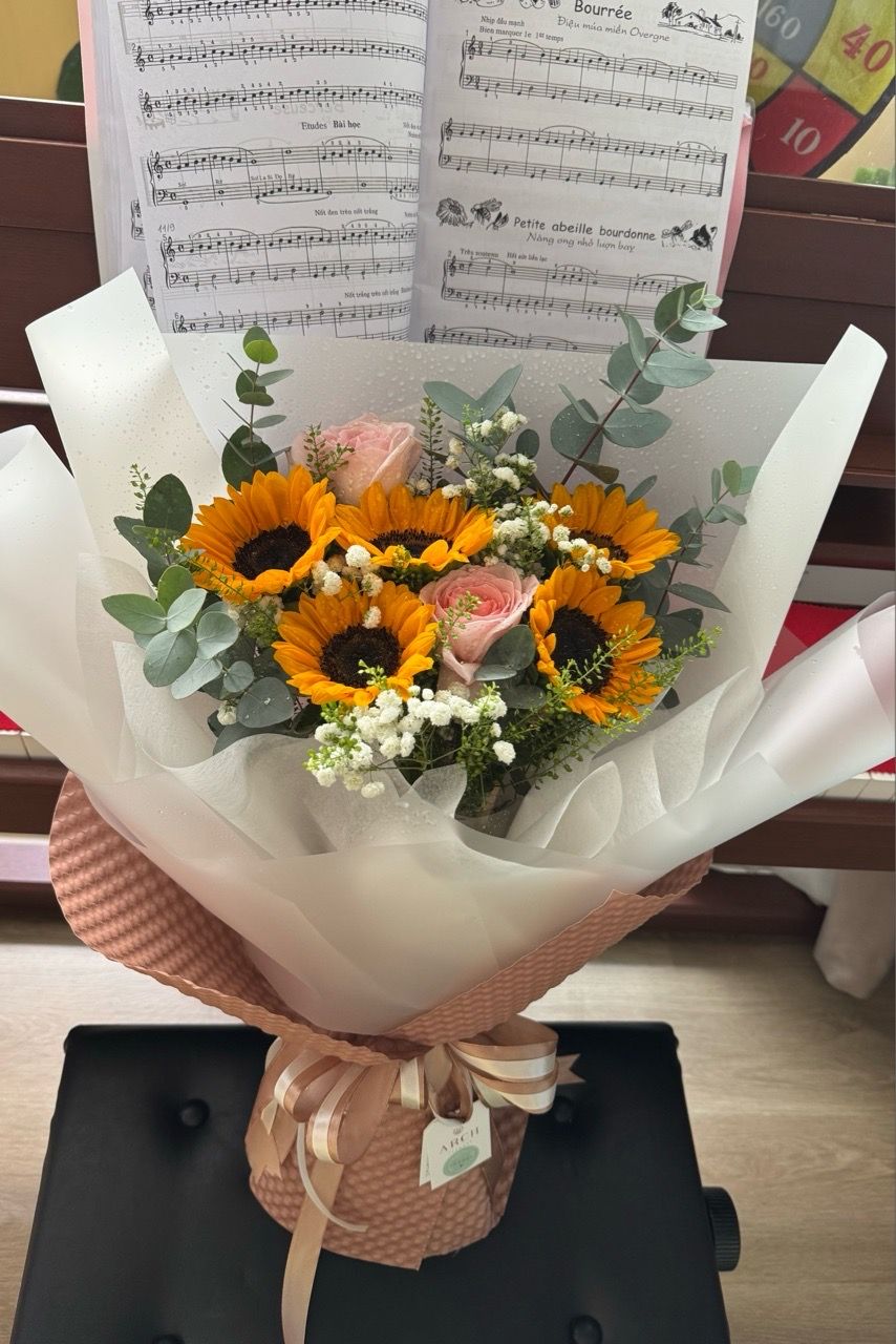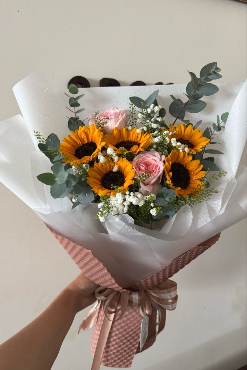 - Size vừa: 5 bông hoa hướng dương , hoa phụ , giâý gói hoa