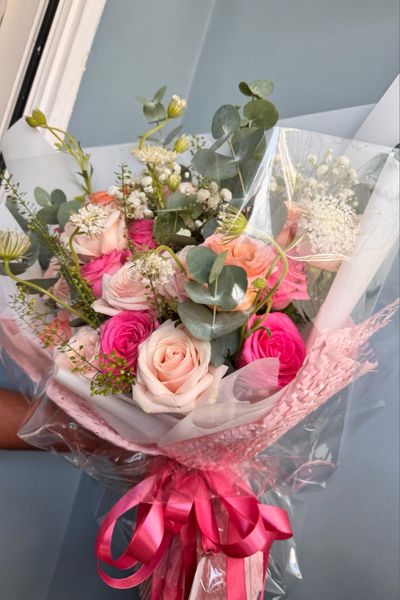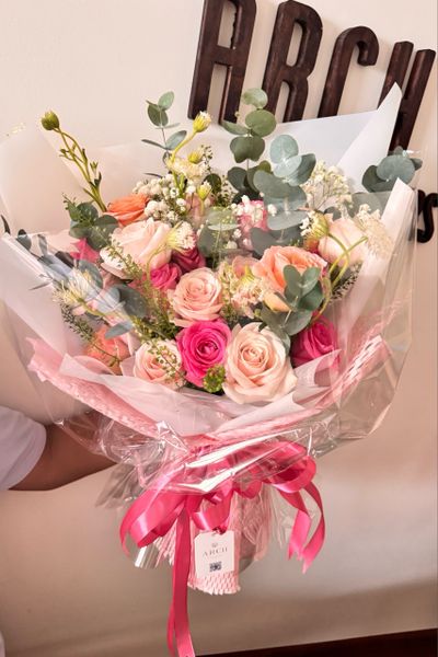 - Size vừa: 20-22 bông hoa hồng các loại, kèm giấy gói hoa, lá đô la, hoa phụ