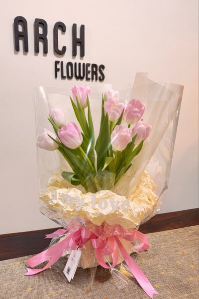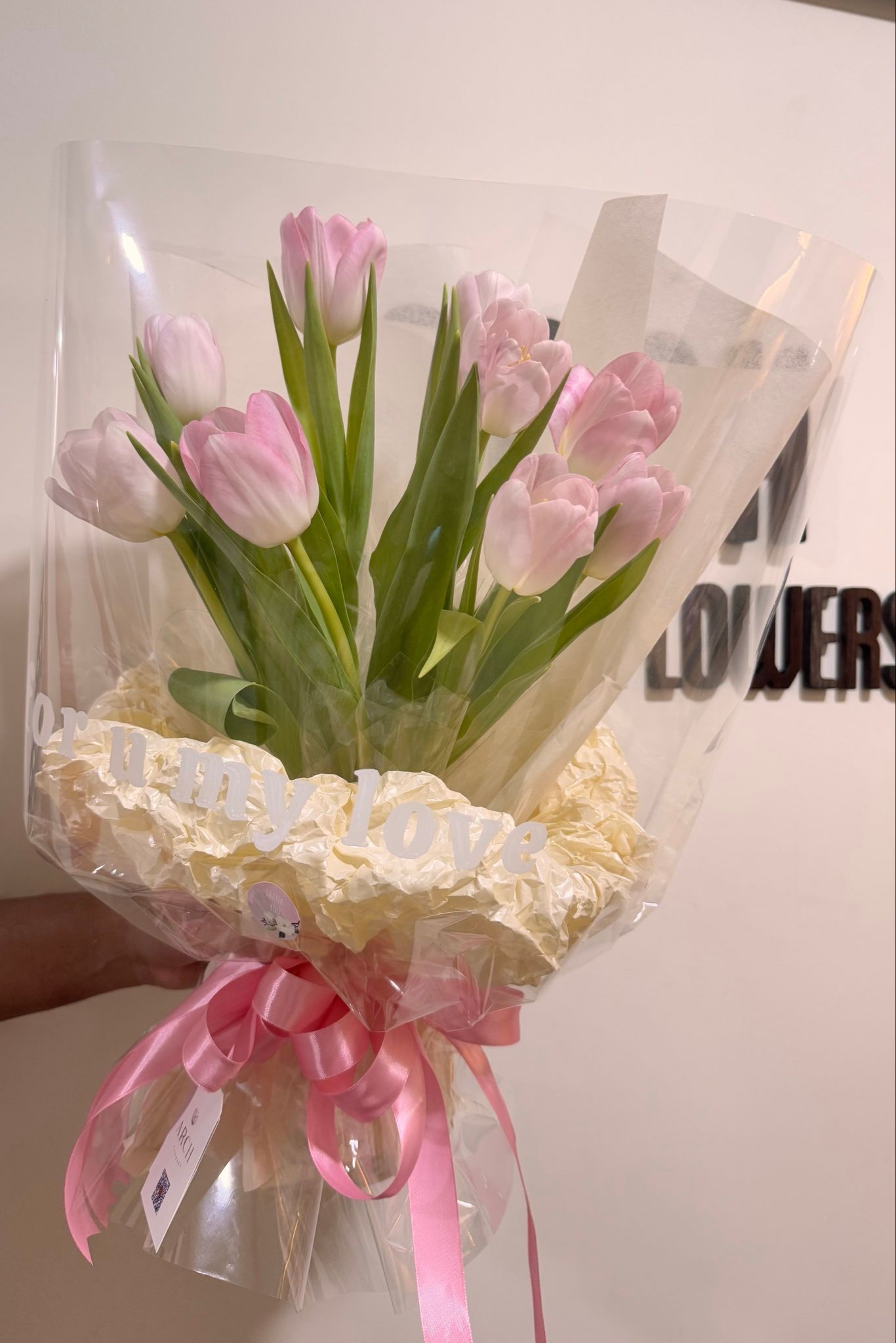 - Size vừa: 9 bông hoa tulip hồng, giấy gói hoa, nơ