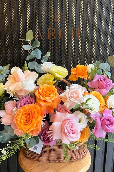 - Giỏ hoa gồm : Hoa hồng spirit giống nhập, hoa hồng kem,hoa hồng pastel,hoa hồng phấn,hoa cát tường xanh, hoa bibi mix cùng các loại lá