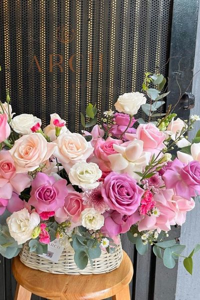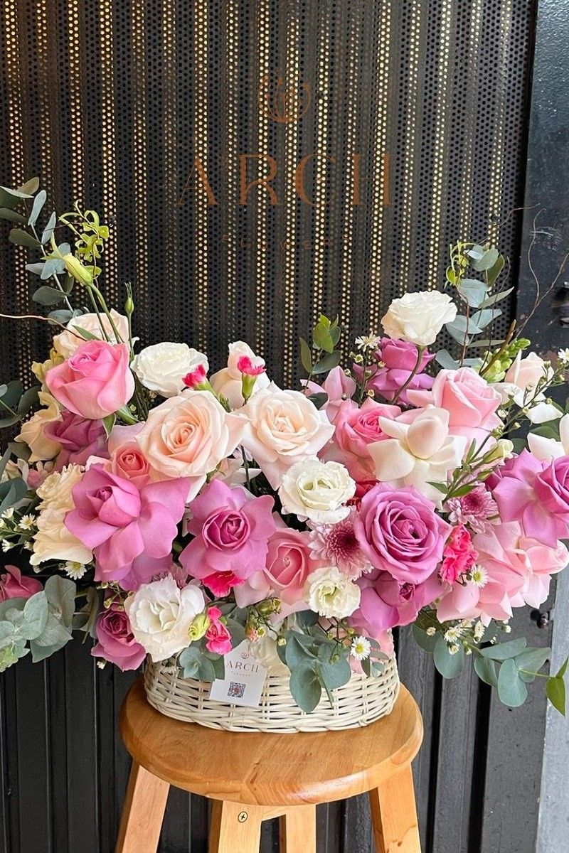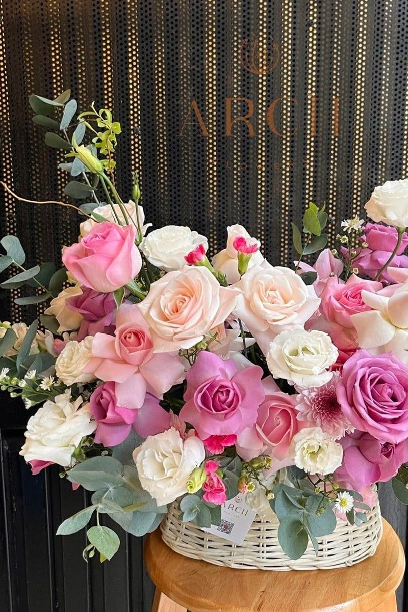 - Giỏ hoa gồm : Hoa hồng tím, hoa hồng kem,hoa hồng pastel,hoa hồng phấn,hoa cát tường xanh,cát tường trắng, hoa thạch thảo hoa bibi mix cùng các loại lá