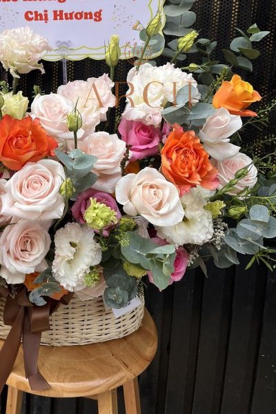 - Giỏ hoa kết hợp gồm những bông hoa hồng pastel,hoa hồng sen,hoa hồng cam, hoa cát tường màu xanh, màu trắng, hoa bi trắng mix cùng với các loại lá.