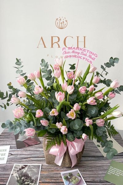 - Gồm: 25-30 bông hoa tulip hồng, lá đô la