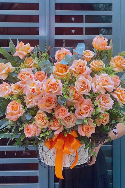 - Gồm: hoa hồng màu cam nhẹ, lá đô la, hộp hoa, nơ