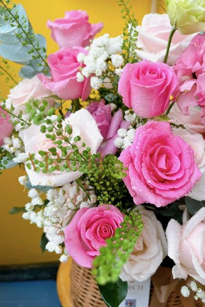 - Giỏ hoa gồm: 25-30 bông hoa hồng phấn, hoa hồng kem