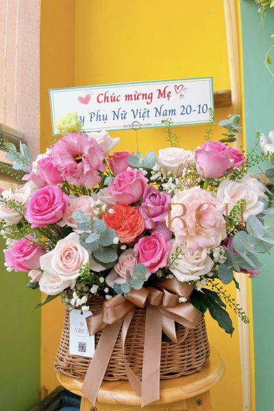- Giỏ hoa là sự kết hợp mạnh mẽ và đối lập nhưng lại rất hài hòa giữa những bông hoa hồng màu hồng sen, hồng pastel, hồng phấn và hoa hồng màu cam ,cùng hoa bi trắng và các loại lá....