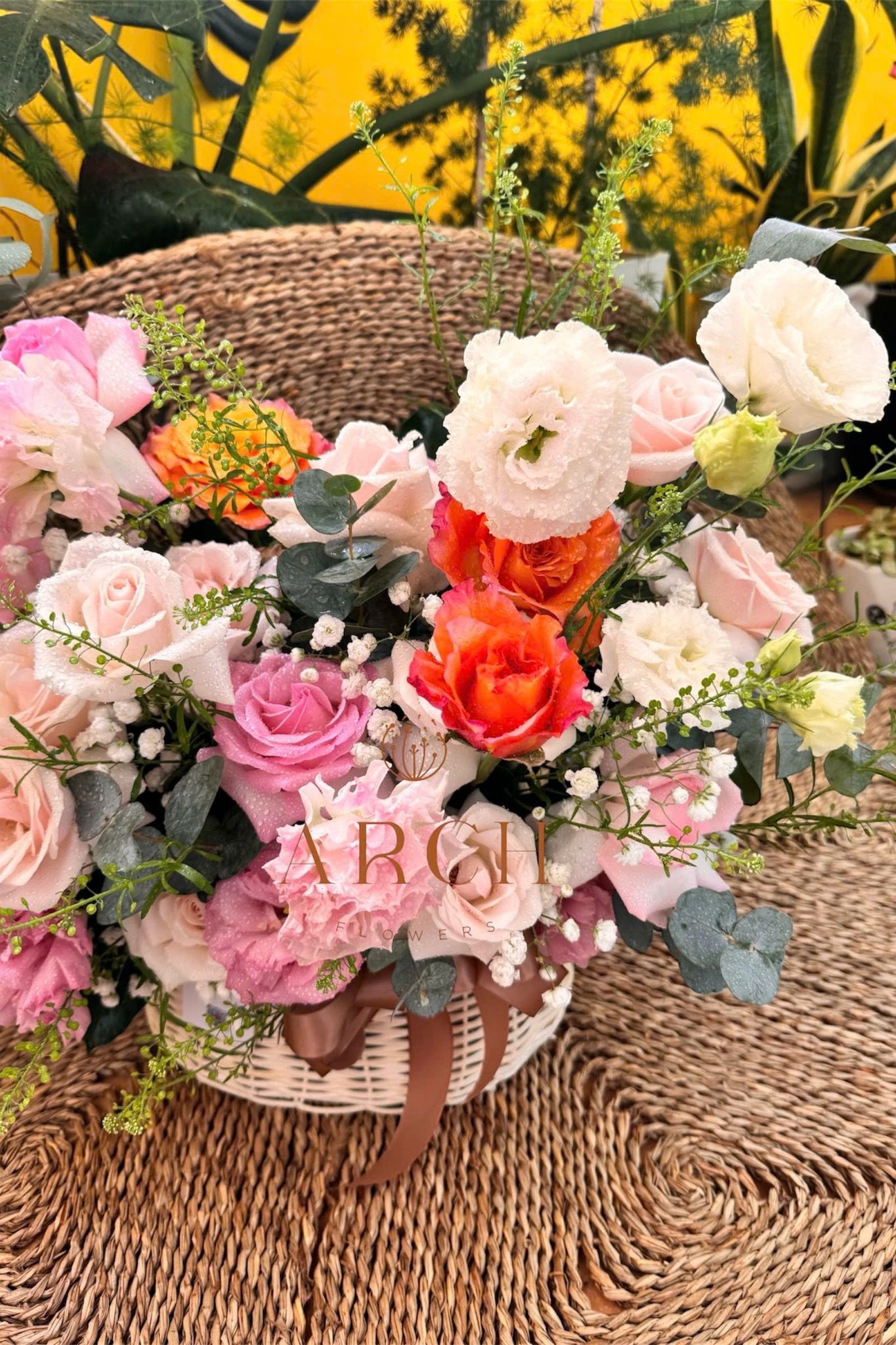 - Một giỏ hoa hồng ngọt ngào thường được thiết kế với sự tinh tế, tạo nên một món quà hoàn hảo để gửi gắm tình cảm và sự quan tâm. Các bông hoa hồng trong giỏ thường có màu sắc chủ đạo là hồng nhạt, trắng, hoặc đôi khi là sự pha trộn của các tông màu pastel nhẹ nhàng như hồng phấn, hồng cam, hay hồng tím.