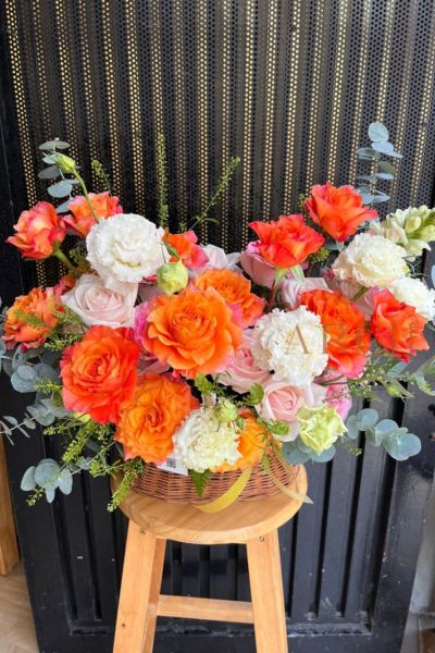 - Giỏ hoa tông cam nổi bật với những bông hoa hồng spirit giống nhập, hoa hồng màu hồng,hoa cát tường màu trắng,xanh,hoa mõm sói trắng, hoa bibi mix cùng các loại lá