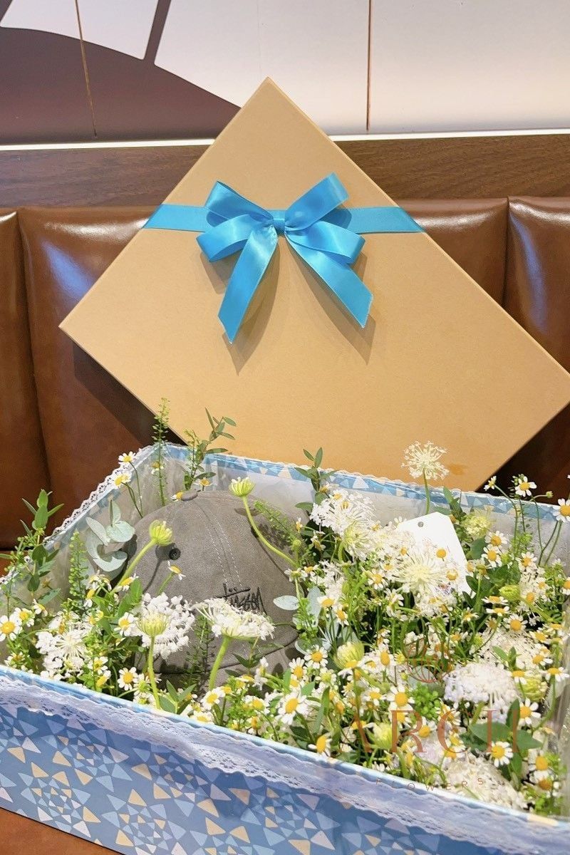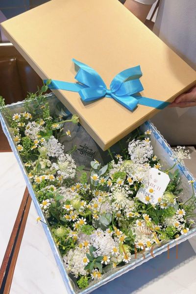 - Hộp hoa là sự kết hợp tinh tế của các loại hoa ren trắng, Hoa cúc Tana trắng cùng các loại lá bạc, lá đồng tiền và món quà tặng theo yêu cầu của khách quý