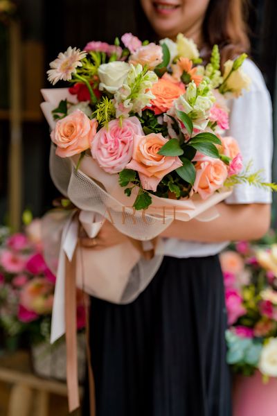 - Số lượng hoa gồm: Từ 20-30 bông hoa hồng, hoa hồng kem, hoa cát tường,hoa mõm sói, hoa cẩm chướng kết hợp cùng các loại lá...