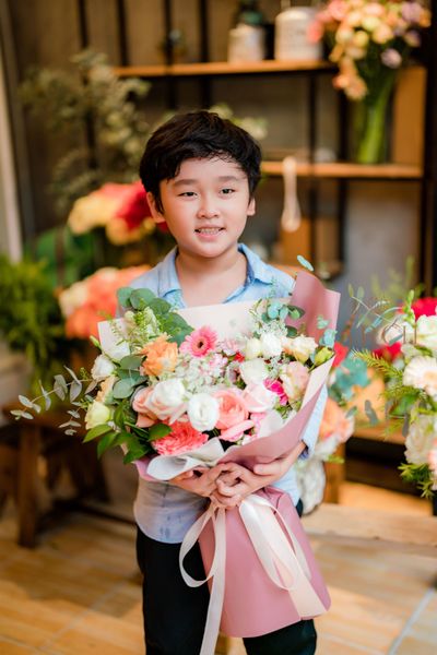- Số lượng hoa gồm: Từ 20-30 bông hoa hồng, hoa hồng kem, hoa cát tường, lá bạc...