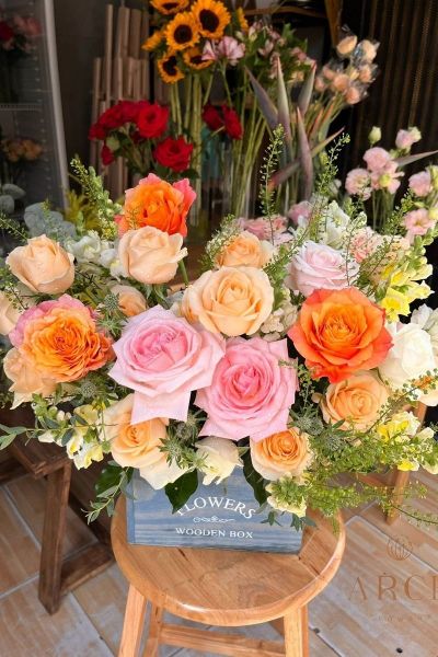 - Hộp hoa gồm : hoa hồng spirit giống nhập, hoa hồng ohara giống nhập, hoa hồng màu mỡ gà, các loại lá..