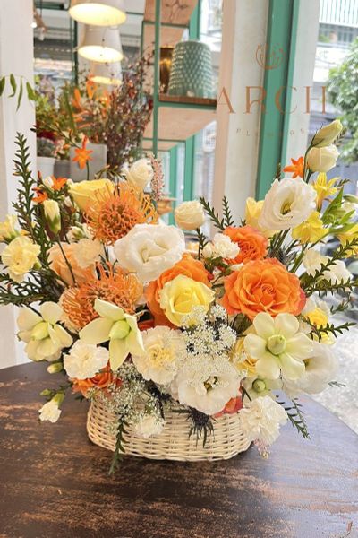 - Giỏ hoa gồm, 2 bông hoa san hô nhập, 25-30 bông hồng giống nhập màu vàng và cam, cát tường, kim ngư thảo, lá đola