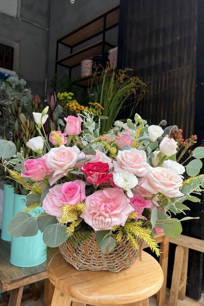 - Giỏ hoa gồm: 20-25 bông hoa hồng pastel, hoa cát tường mix cùng với các loại lá.