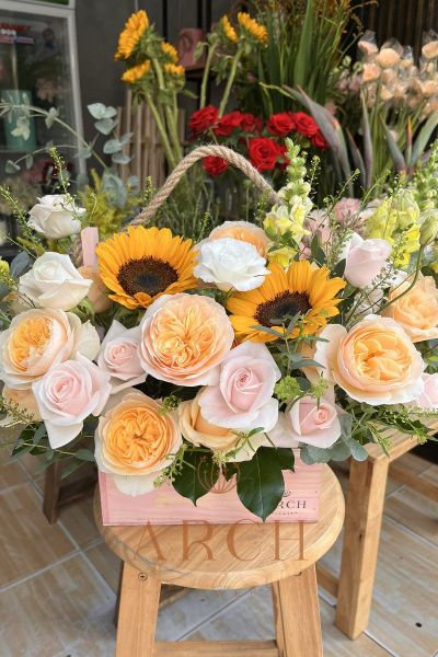 - Sự khéo léo giữ hoa hồng juliet và hoa hướng dương giúp cho giỏ hoa trở nên hài hoa, tinh tế.