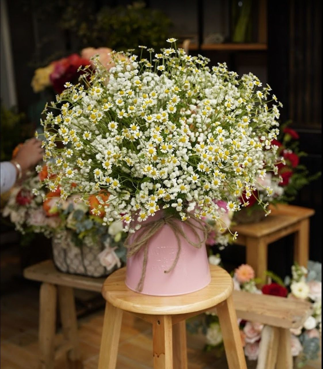 - Bạn có thể kết hợp hoa cúc ta na và hoa bi. Đây là hai loại hoa nhỏ bé mang vẻ đẹp riêng