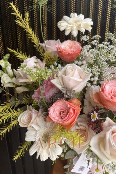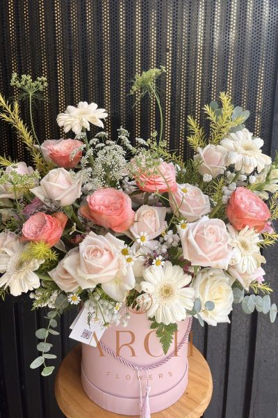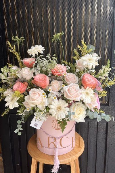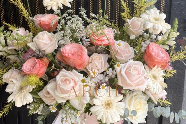 - Hộp hoa gồm: Hoa hồng màu hồng,màu kem,màu trắng,màu cam, hoa đồng tiền màu trắng , hoa mõm sói trắng,hoa ren trắng kết hợp cùng các loại lá.