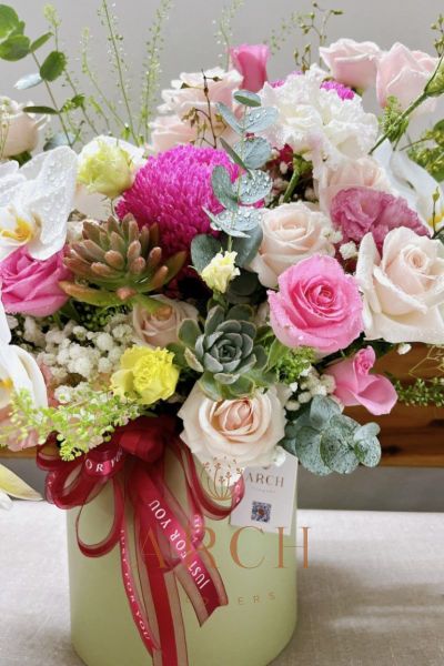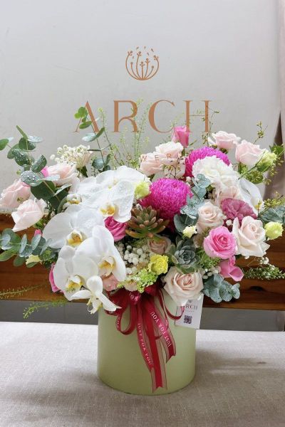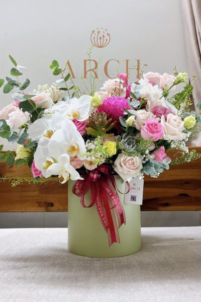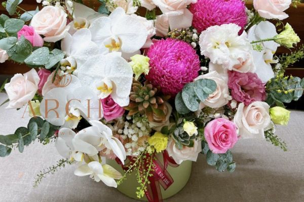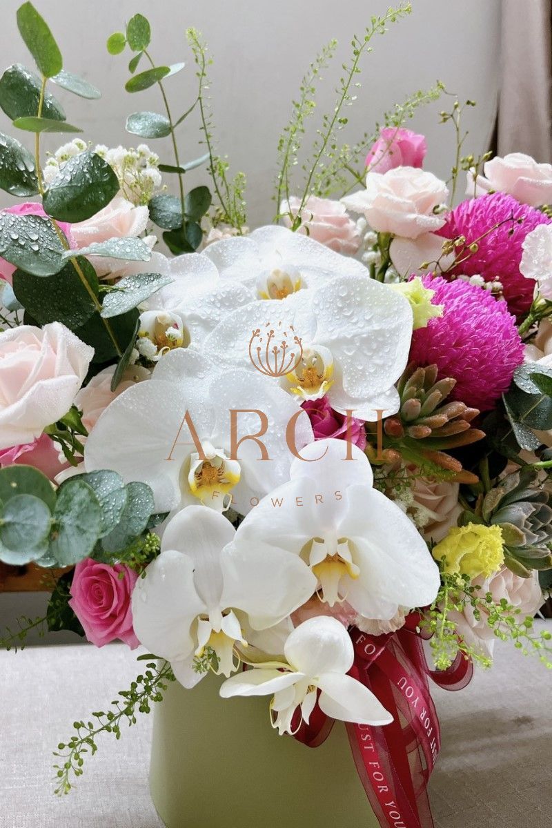 - Đặc biệt điểm nhấn nổi bật là cành lan hồ điệp trắng và hoa sen đá làm nên hộp hoa trở nên cực kì sang trọng