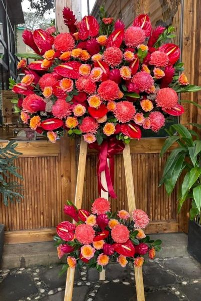 - Kệ hoa tông đỏ gồm: size to từ 70-75 hoa hồng đỏ, hoa cúc mẫu đơn đỏ, hồng Spirit, hoa hồng môn đỏ, hoa hạnh phúc kết hợp cùng các loại lá ... size vừa từ 50-70 bông hoa hồng đỏ và hoa lá phụ