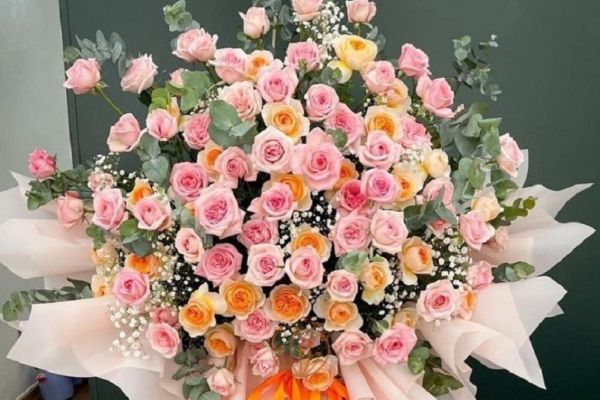 - Số lượng hoa: gồm 40 bông hoa hồng pastel, 20 bông hoa hồng sen, hoa hồng spitit, hoa bibi, lá đola