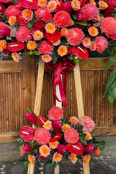 - Kệ hoa tông đỏ gồm: size to từ 70-75 hoa hồng đỏ, hoa cúc mẫu đơn đỏ, hồng Spirit, hoa hồng môn đỏ, hoa hạnh phúc kết hợp cùng các loại lá ... size vừa từ 50-70 bông hoa hồng đỏ và hoa lá phụ