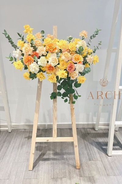 - Kệ hoa gồm: từ 20-30 bông hoa hồng vàng, hoa hồng spirit, hoa hồng pastel, lá đola, lá táo