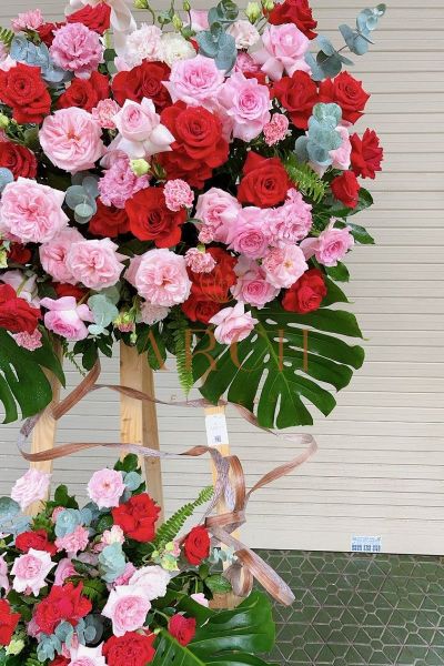 - Kệ hoa là sự kết hợp của 50 bông hoa hồng đỏ và 50 hoa hồng màu hồng phấn , kết hợp cùng các loại lá….